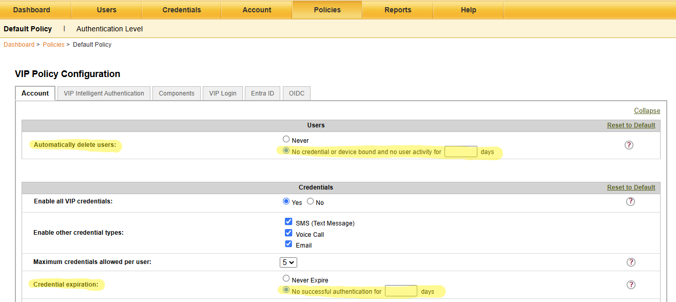 In conjunction with the Automatic Delete User policy, the Credential Expiration policy (Policies tab > Account tab > Credentials section) can be used to dissociate credentials from their respective users. An expired credential will become inactive and will be removed from the user. This action satisfies one of the two criteria listed above. And after the second criteria is met, the Automatic Delete User policy takes effect with which the users will then be deleted.