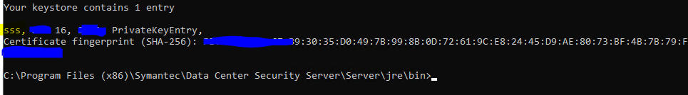 C:\Program Files (x86)\Symantec\Data Center Security Server\Server\jre\bin>keytool.exe -keystore "C:\Example\sss.ssl" -storepass "CdlxmLPSnCng65ttkeXXXtWhAS4fIlfuRlanOXxc" -storetype PKCS12 -list