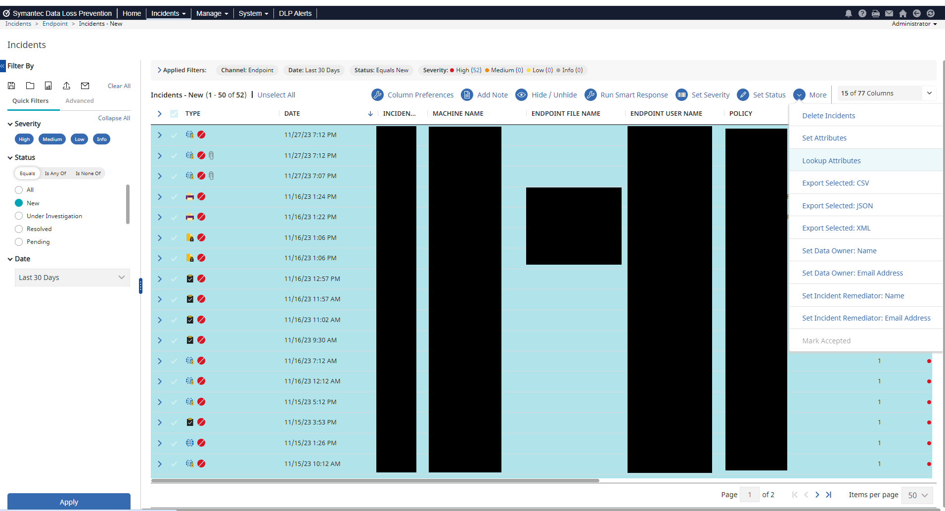 In the DLP Enforce Console on any incident list page you cannot run the "Lookup Attributes" incident action after having selected all incidents with the "Select All" option. The "Lookup Attributes" incident action will not run and there will be no green banner confirmation message to confirm the action.