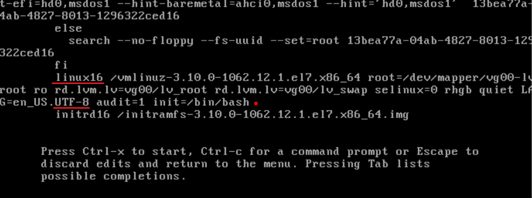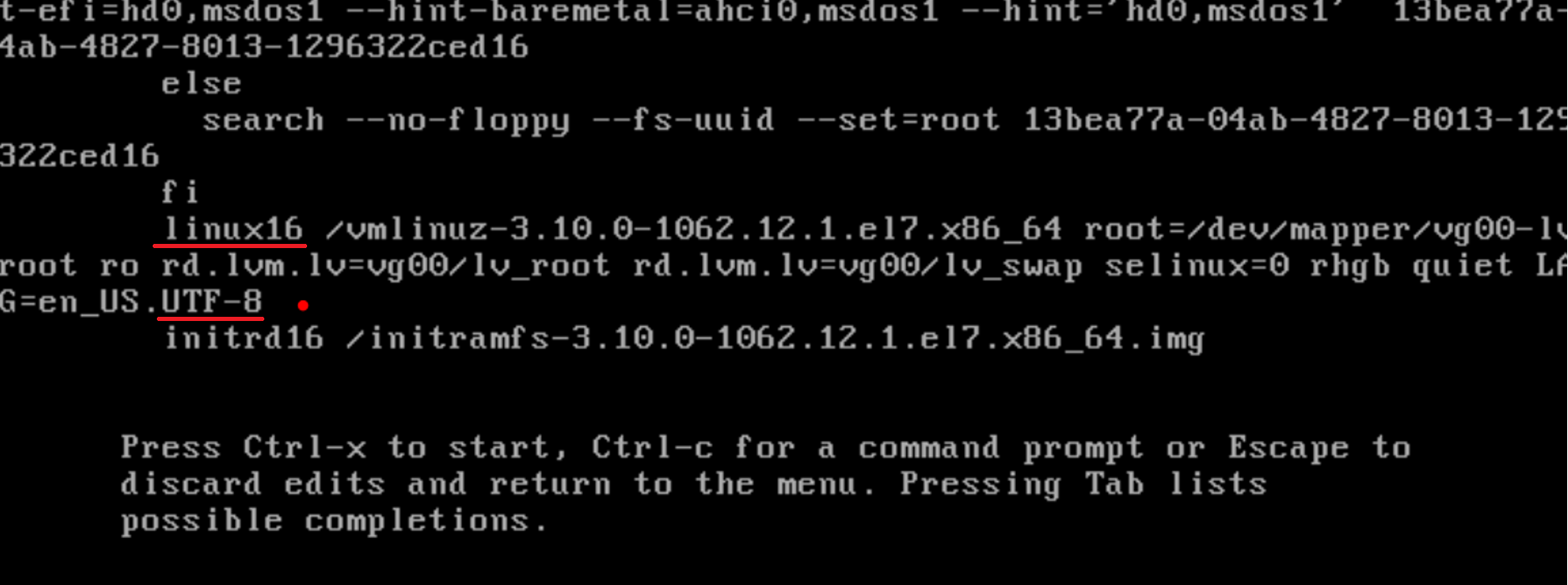 3. 下矢印キーで「linux16」という単語を検索してから、右矢印キーを使用して UTF-8 まで移動します。
