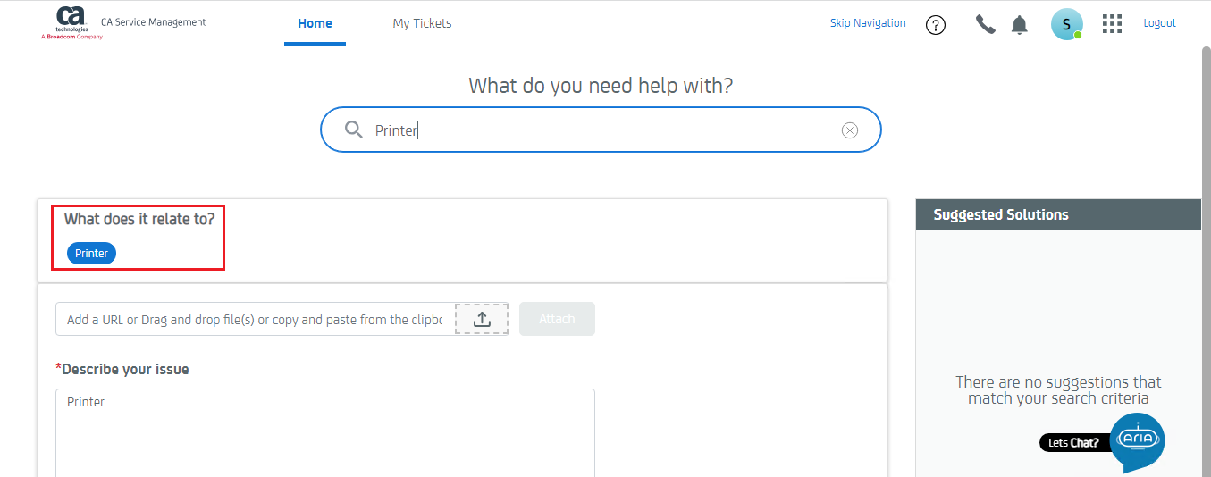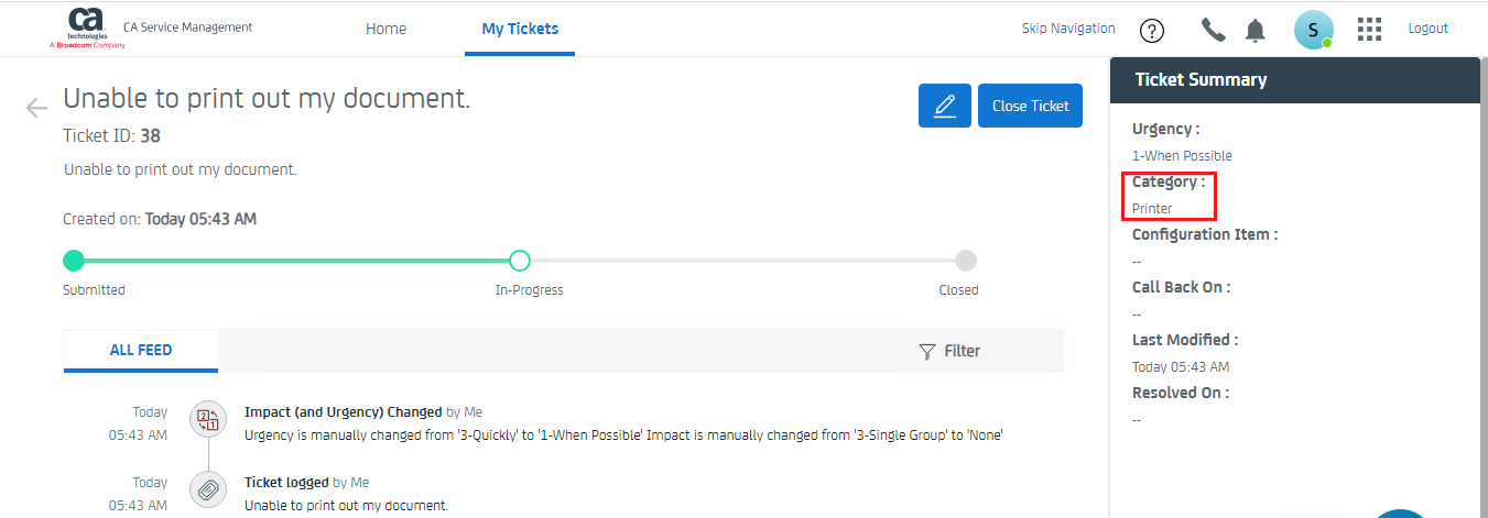 A new ticket is created successfully and it has the Category "Printer" as expected, but this behavior causes confusion to end users as no category is highlighted.