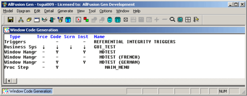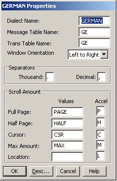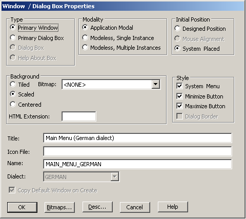 During generation, a subdirectory with the name of the dialect is created under the c subdirectory of the model. The Window Manager c source with its associated RC file is placed in this subdirectory. The RC file includes the dialect-specific [xx]gui.rc file with the translations for Window and Help submenus. The characters for [xx] are taken from the message table name in the dialect definition.