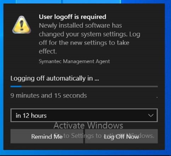 - If multiple logged in sessions exist on the machine then the notification will be transformed into the confirmation window when the user presses "log off now", "restart now", or "shutdown now"