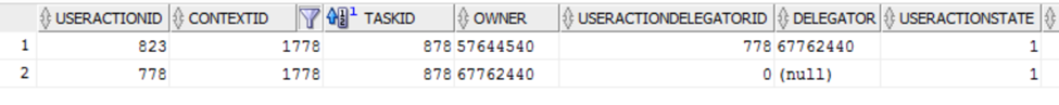 The useractiondelegatorID and delegator column refer to the user who has shared the work.
