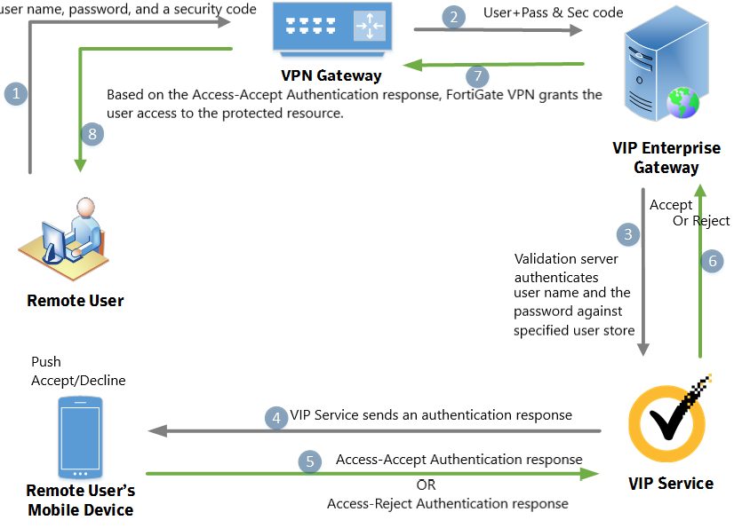 For users who have installed VIP Access on their registered mobile devices, VIP Service sends a VIP Access Push notification message to the mobile device. The user must tap Allow on the device to perform the second-factor authentication and complete the sign-in. VIP Access Push authentication with the User ID + LDAP Password + Security Code authentication method is explained in above image. If the provided credentials are correct, and you accept or reject the VIP Access Push notification on your registered mobile device FortiGate VPN authenticates user's access of protected resources.