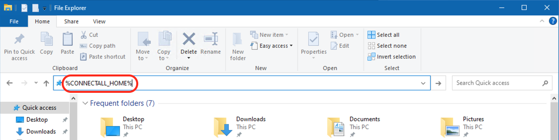 For Windows you can discover the location by opening a File Explorer window and typing %CONNECTALL_HOME% in the bar as shown below:
