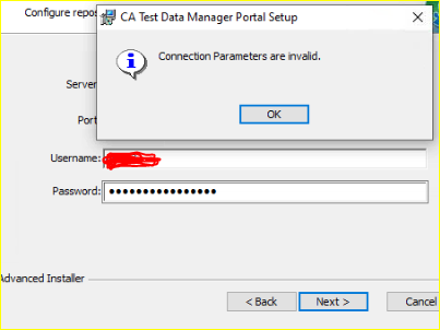 Created a GTREP repository database in Oracle 19c and trying to connect to it during TDM Portal installation 4.10.0.58 and getting the error " Connection Parameters are invalid" as in below screenshot.