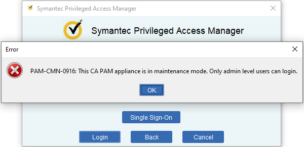 PAM-CMN-0916: This CA PAM appliance is in maintenance mode. Only admin level users can login.