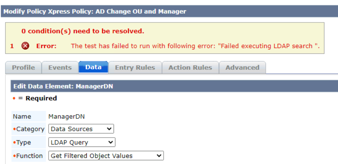 While doing a specific LDAP search from the Policy Xpress data element test we are seeing this error: The test has failed to run with the following error: "Failed executing LDAP search ."