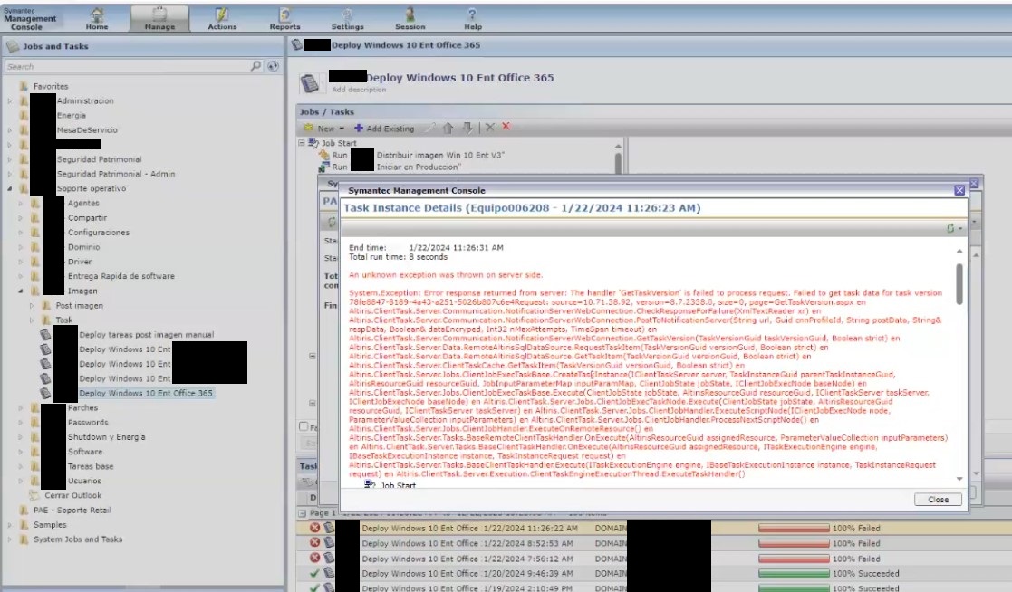An unknown exception was thrown on server side. System.Exception: Error response returned from server: The handler 'GetTaskVersion' is failed to process request. Failed to get task data for task version 78fe8847-8189-4a43-a251-5026b807c6e4Request: source=10.71.38.92, version=8.7.2338.0, size=0, page=GetTaskVersion.aspx