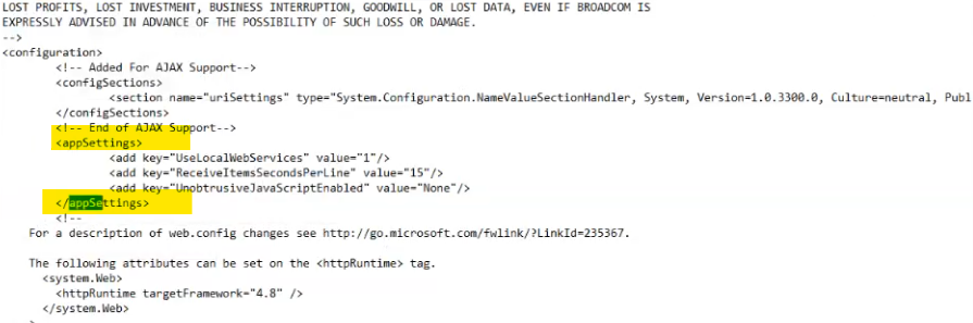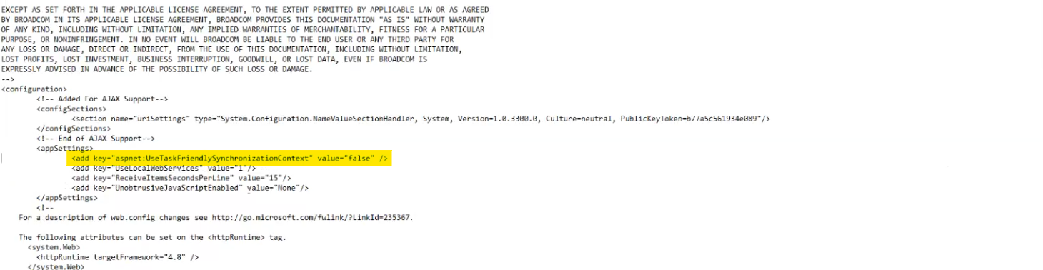 Providing a non-null 'timeoutHandler' or a true 'executeInParallel' parameter value to the PageAsyncTask constructor is unsupported in the current application configuration. To work around this, add the following configuration switch in Web.config:<appSettings> <add key="aspnet:UseTaskFriendlySynchronizationContext" value="false" /></appSettings>For more information, see http://go.microsoft.com/fwlink/?LinkId=252465. [InvalidOperationException @ System.Web.dll] at System.Web.Util.SynchronizationContextUtil.ValidateMode(SynchronizationContextMode, SynchronizationContextMode, string) at System.Web.UI.PageAsyncTask..ctor(BeginEventHandler, EndEventHandler, EndEventHandler, object, bool, SynchronizationContextMode) at Altiris.AssetControl.Web.Receiving.Wizards.PageAsync.Setup(PageAsync, AsyncCallback, Page, int, HttpContext, EndEventHandler, EndEventHandler, EndEventHandler) at Altiris.AssetControl.Web.Receiving.Wizards.ReceiveItems.ReceivingItemsGrid_receiveBtnClicked(object, EventArgs) at Altiris.Receiving.Controls.ReceivingEditableGridControl.OnReceiveBtnClicked(object, EventArgs) at Altiris.Receiving.Controls.ReceivingEditableGridControl.btnGenerate_Click(object, EventArgs) at System.Web.UI.WebControls.Button.OnClick(EventArgs) at System.Web.UI.WebControls.Button.RaisePostBackEvent(string) at System.Web.UI.Page+<ProcessRequestMainAsync>d__523.MoveNext()