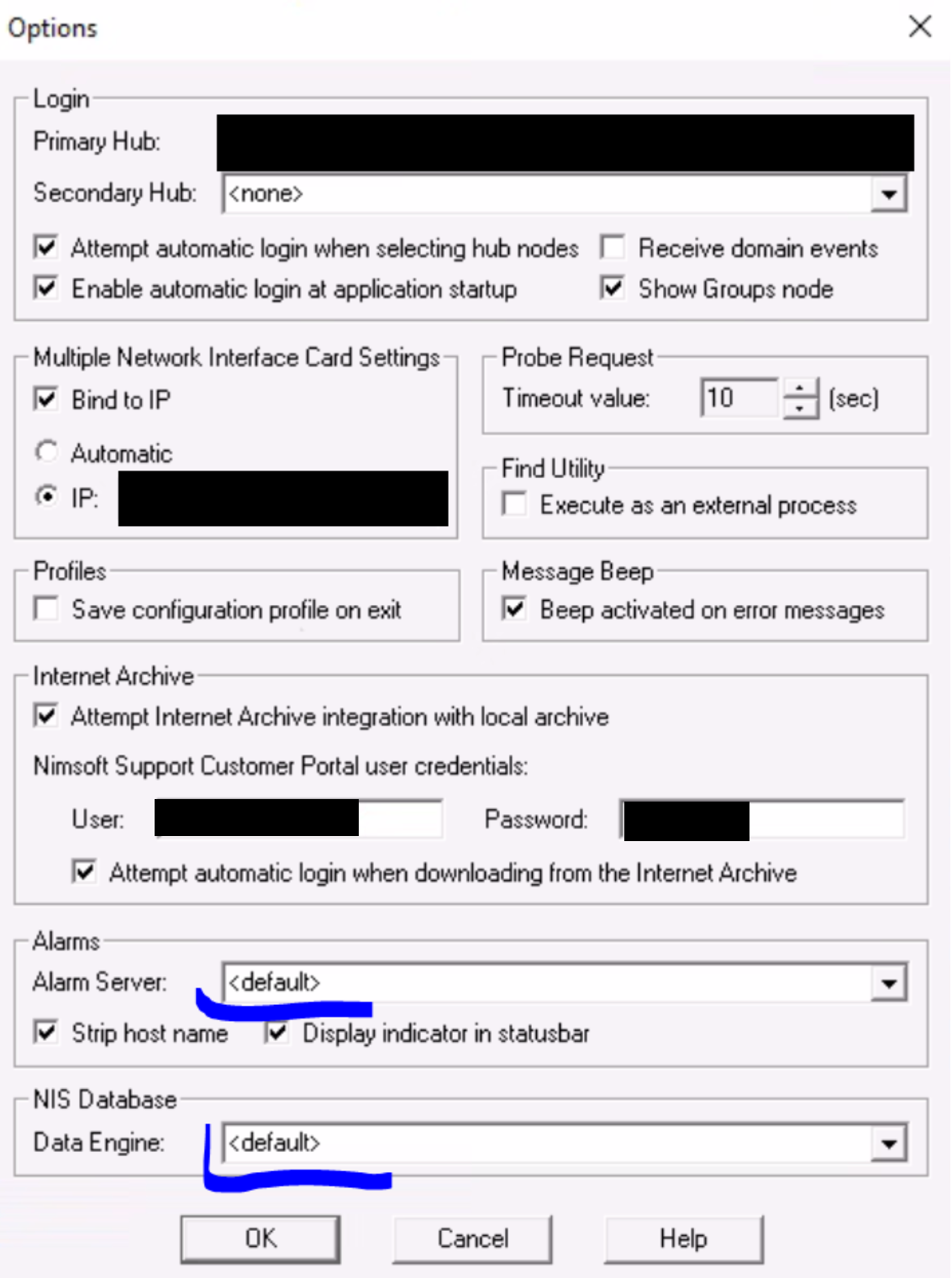 Change the "Alarm Server" and "Data engine" sources to "default"and click "ok", as presented on the below screenshot: