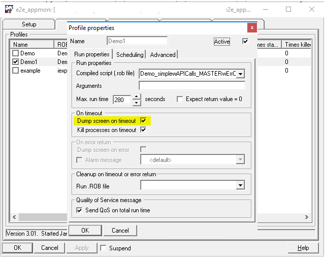 Please refer to the e2e_appmon probe-> Profile Run Properties Tab:
