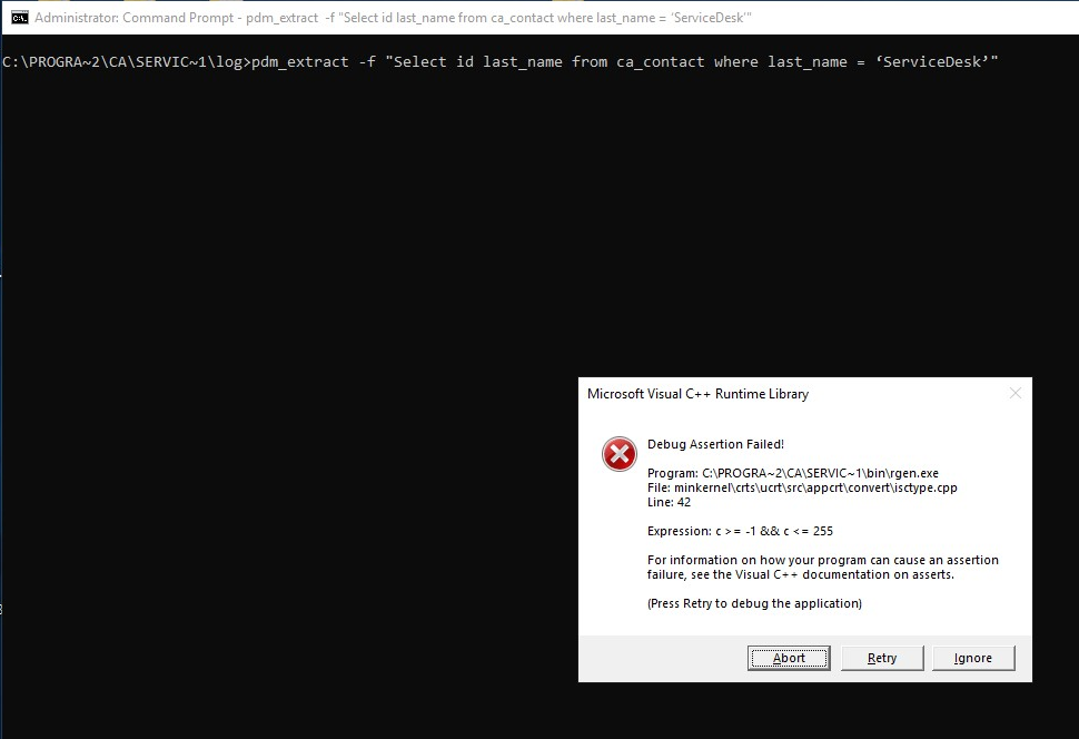 When running a pdm_extract command such as this, a "Debug Assertion Failed" message may present against the rgen.exe binary: