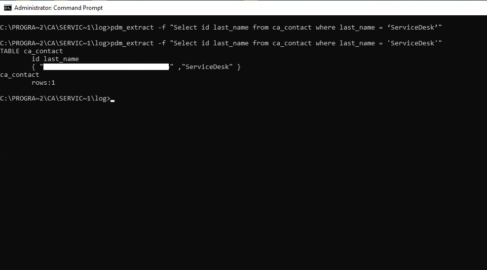 pdm_extract -f "Select id last_name from ca_contact where last_name = ‘ServiceDesk’"