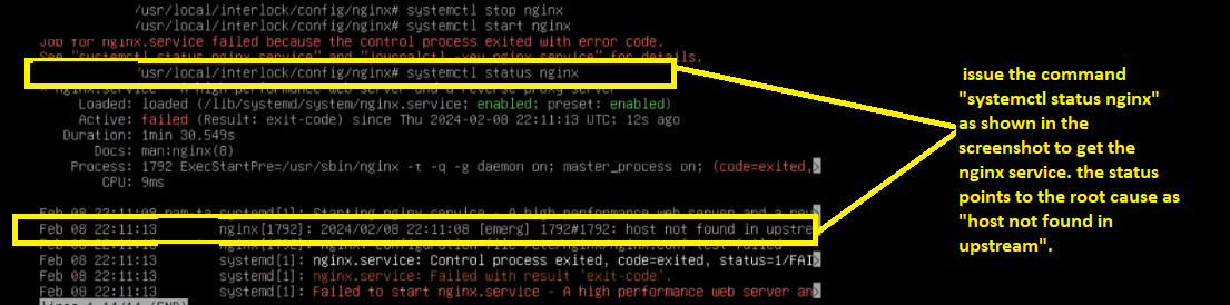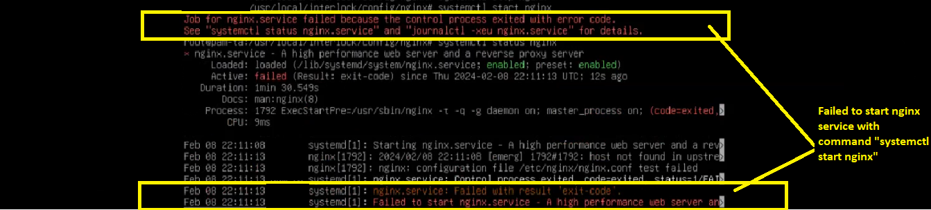 A reboot did not resolve the issue as nginx service fails to start automatically. In addition, usage of "systemctl start nginx" command also does not start the nginx service and fails as shown below: