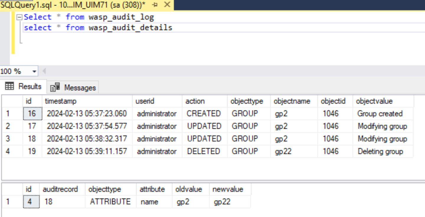 Ex. Modify group name. This requires to log the old name and new name of the modified group as well along with the object level information. In this case we see entries in both of these tables.