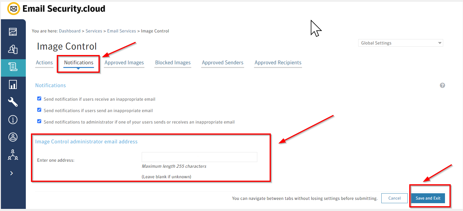 Instructions on defining the administrator email address for Image Control in Email Security.cloud