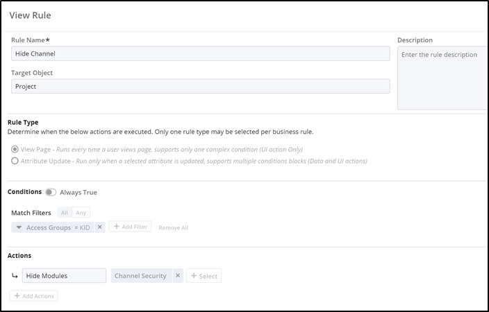 - Create a business rule on blueprint to only display the modules from step 6 and step 7 when user is part of group created in step 3 (Refer screenshot below for example on business rule). The two modules should be hidden for everyone who are not part of the group.