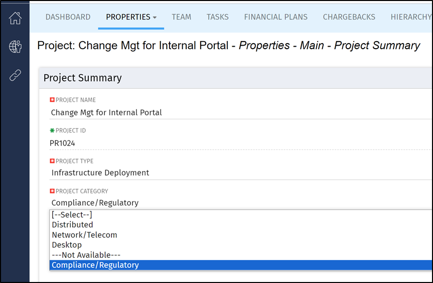 Classic UI Layout edit View: The previous value is retained in the Project Category field and the new value on Project Type is saved