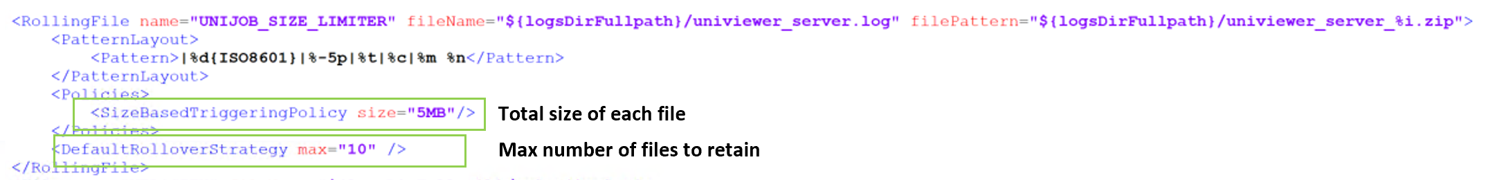 - To change each log file size to 20MB <SizeBasedTriggeringPolicy size="20MB"/>