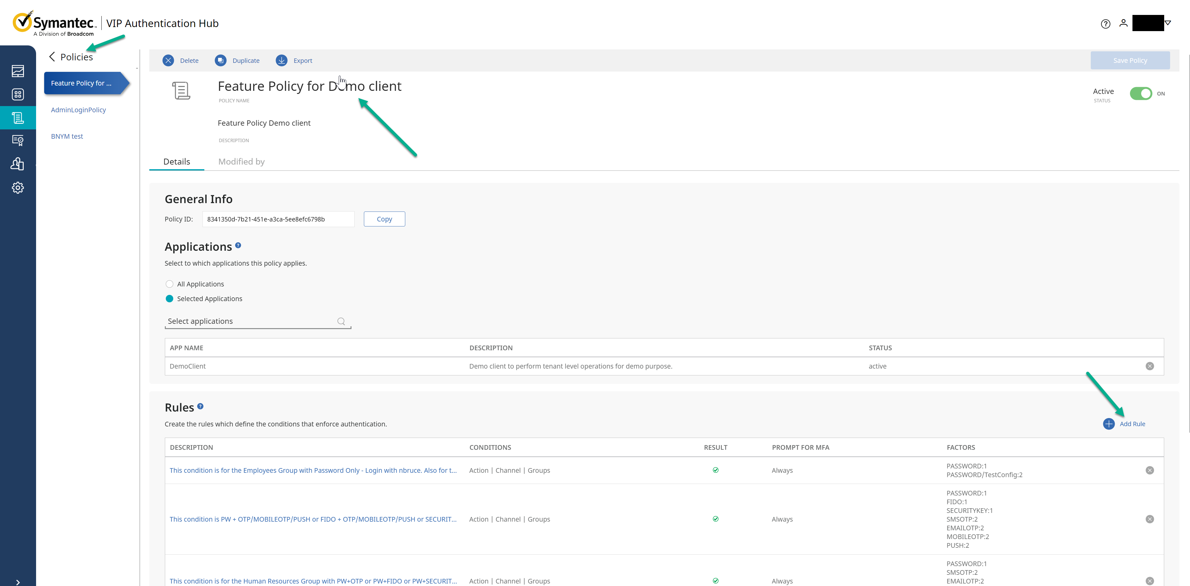1. In the screenshot below I am using the Feature Policy for Demo Client default policy, click on the Add Rule to create a new rule for the Risky country.