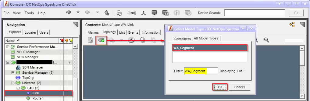 Do not simply draw a pipe between the device and the WA_Link model. Proper WA_Linnk requires a nested WA_Segment. In addition, an interface model on each device must be connected to the WA_Segment (and not to the WA_Link). This modeling paradigm enables DX NetOps Spectrum to establish a fully resolved connection. It also enables the proper display of pipes in the Global Collection topology view.