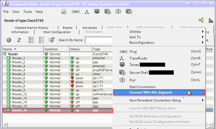 8. Go to the device's Interface tab, select the port, right-click, and select the "Connect With WA_Segment" (this is the model name you started the connection) option: