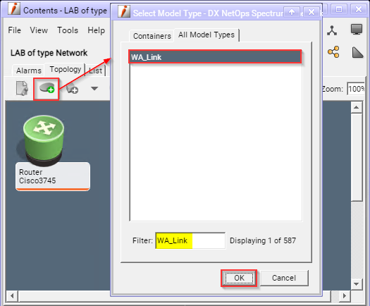 1. Create a WA_Link model by clicking on the "Creates a new model by type and adds it to this view" button in the Topology tab.