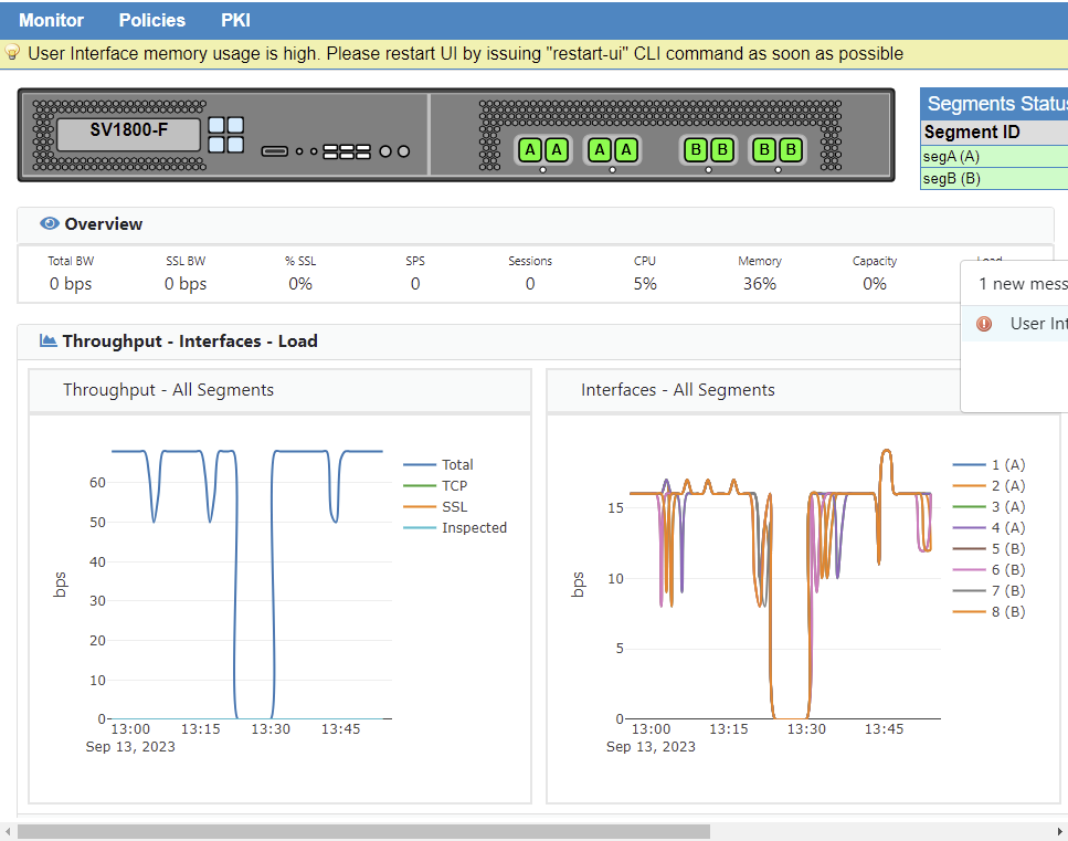 In 4.5.13.1 SSLv release, when the memory usage reaches a pre-configured threshold for the uWSGI, the user will be prompted with a notification in the GUI to restart the UI using the CLI command restart-gui. The notification looks like the screenshot below. This will also force currently logged users to logout.