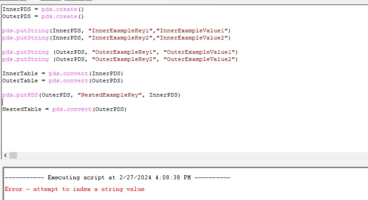 For example - here is a snippet of Lua code that creates two PDS's, an "Inner" and "Outer" PDS and puts a couple of key/value pairs inside each one, and then converts each PDS to a Lua table.