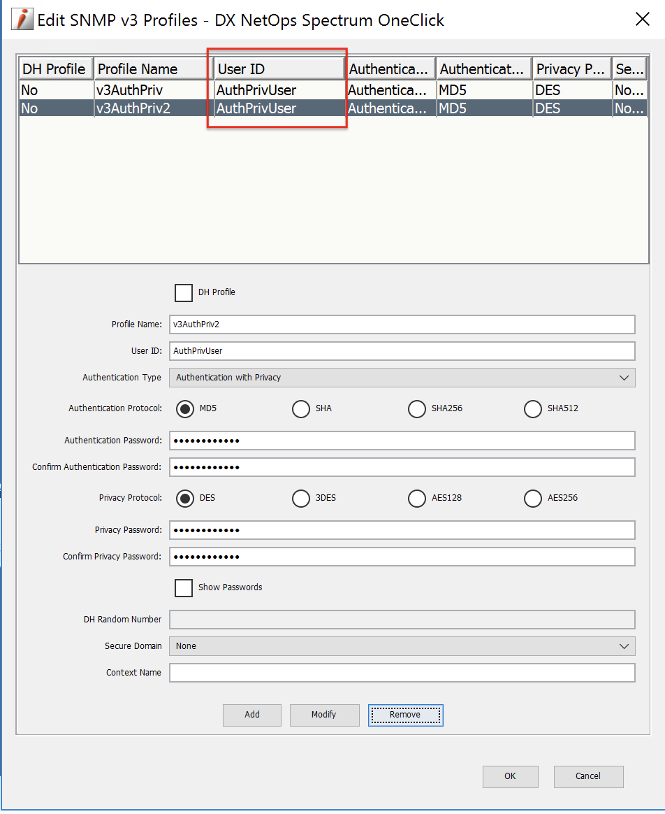 Review the SNMPv3 profiles by navigating to the Discovery window or in Topology - New Model by IP window. If you have more than one SNMPv3 profile with the same User ID name, then the SpectroSERVER may ignore the traps: