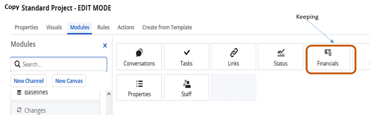 In MUX, if you open a copy of a blueprint (such as Project) you can edit it and click on the modules icon. There you should see the Financials as well as the Financial Plans modules.