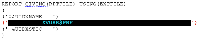 REPORT GIVING(RPTFILE) USING(EXTFILE)