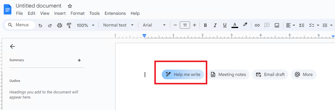 In Google Docs, an applet with "Help Me Write" caption would show on a blank page: