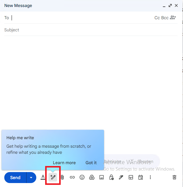 Similar to that, in Gmail, in the "compose" message window, a "Help me Write" would show up as well: