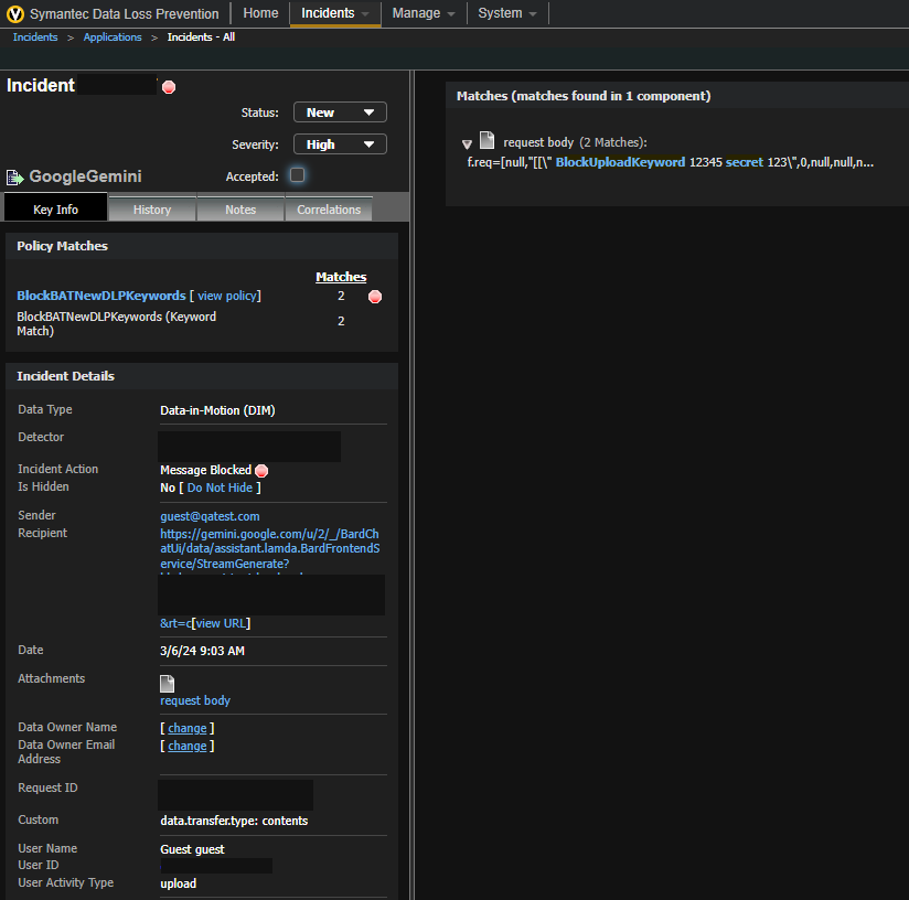 Entering the keyword into Gemini (or its applets) would be blocked, and a DLP Incident will be generated, the DLP incident will look like this:
