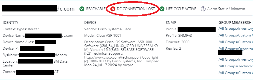 When we check a few REST calls to the DA using the device Item ID we see the same values show as Up. We checked the DA at https:<DA_HOST>:8582/rest/devices/<DA_Item_ID> where it shows a UP state for </ContactStatus> and </CalculatedContactStatus> values.