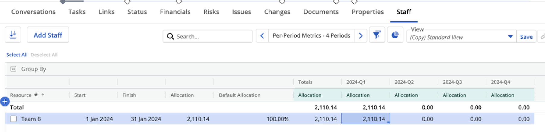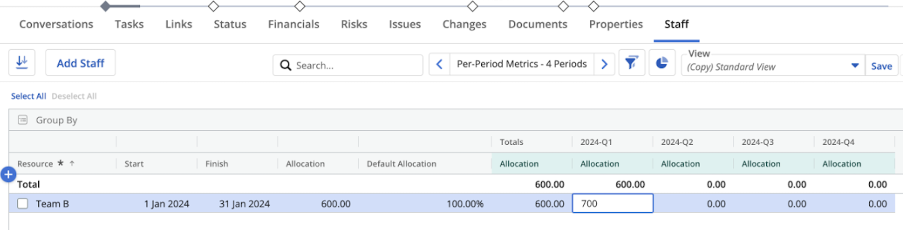 2. Modify the Allocation figure on the project staff for 2024 – Q1 , for example to 700