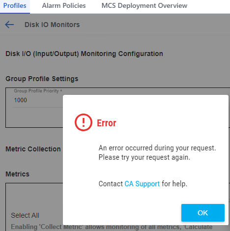 An error occurred during your request, Please try your request again. Contact CA Support for help.