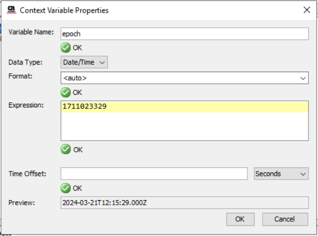 1. Use a context variable to set the epoch time. Make sure to use a Date/Time Data Type.
