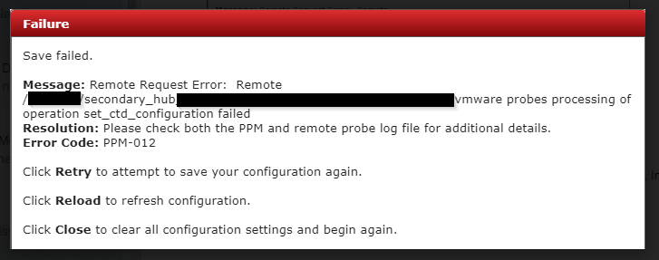 When trying to save a new profile in the vmware probe, I am getting a PPM-012 error for "processing of operation set_ctd_configuration failed" and the configuration cannot be saved.
