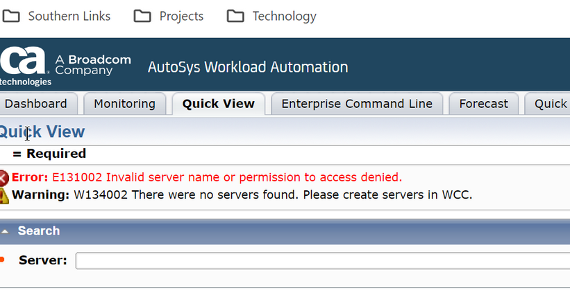 Permission in the EEM WCC0004 Application for the ServerAccess Policy was no longer correct.