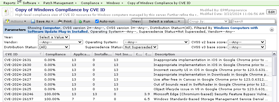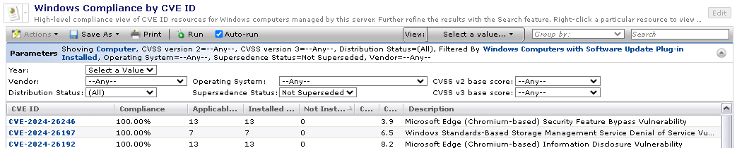 | <a href="/Altiris/Console/Dashboard/DashboardView.aspx?ResourceGuid=86bb9a50-51c0-4099-83d4-d2ce5536d9f2&TabGuid=2B1885A6-C844-4F3A-B842-C5E8E5478DDE" target="_blank" title="CVE-2024-26246">CVE-2024-26246</a> | 100.00% | 13 | 13 | 0 | 3.9 | <span title="Microsoft Edge (Chromium-based) Security Feature Bypass Vulnerability">Microsoft Edge (Chromium-based) Security Feature Bypass Vulnerability</a> | |