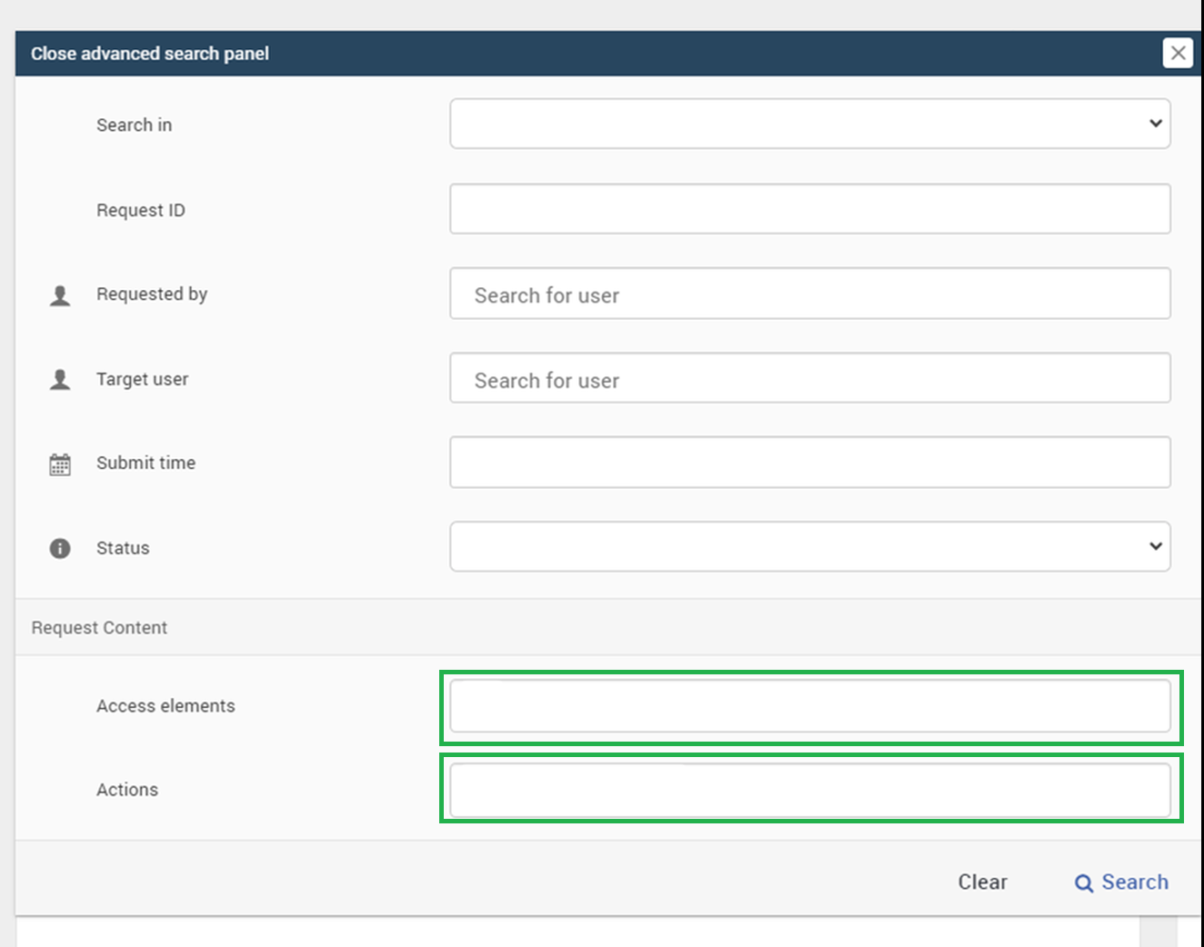 When you Log into the User Module, select My Requests, and click the Advanced Search drop down box, and click on Access Elements / Actions