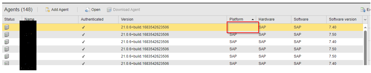 In the administration panel for agents the impacted agent has no value in the column platform is empty
