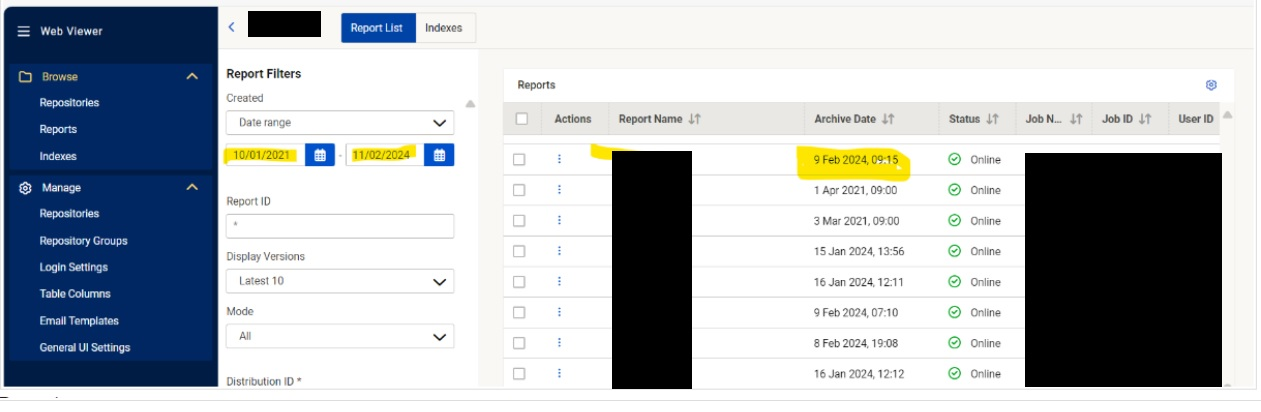 Applied latest Web Viewer maintenance (CARS 2312) in a new TEST environment and unable to access reports using any report filter, even though reports exist for that date range.