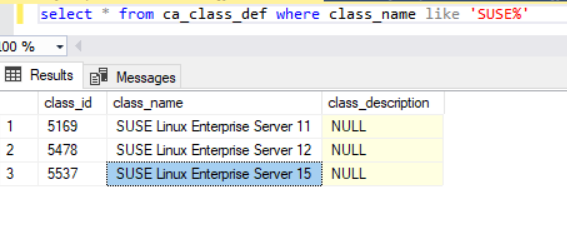 class_id class_name class_description 5169 SUSE Linux Enterprise Server 11 NULL 5478 SUSE Linux Enterprise Server 12 NULL 5537 SUSE Linux Enterprise Server 15 NULL