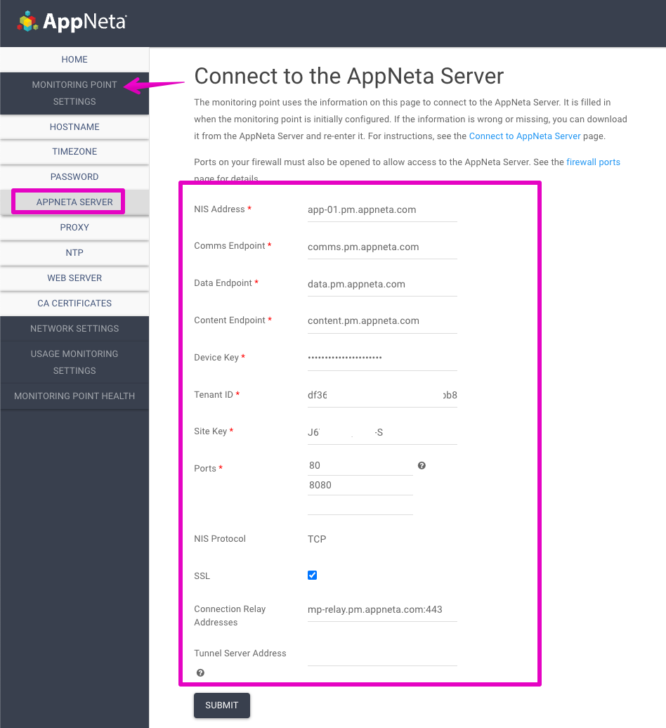 1. Check if you current have any values in your NIS.config section by logging into the WebUI of your Virtual Monitoring Point. Clicking on Monitoring Point Settings > AppNeta Server: