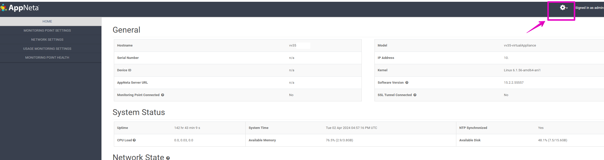 5. Return back to the Virtual Monitoring Points WebUI, and click the gear icon in the top right: